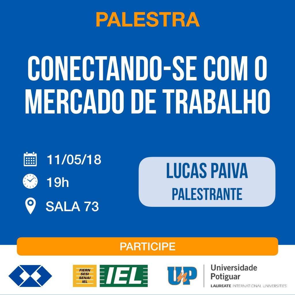 Os egressos da Escola de Gestão da UnP de Mossoró terão a oportunidade de assistir a uma palestra de Lucas Paiva. O tema da palestra será “Conectando-se ao Mercado de Trabalho” e será na próxima sexta-feira (11), a partir das 19 horas, na sala 73 da UnP.