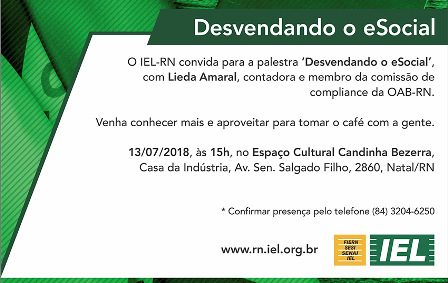 O Instituto Euvaldo Lodi (IEL–RN) realizará a palestra gratuita “Desvendando o eSocial” (leia mais), que será ministrada pela contadora e membro da comissão de compliance da OAB-RN, Lieda Amaral. O evento acontecerá na sexta-feira (13/07), às 15h, no Espaço Cultural Candinha Bezerra, na Casa da Indústria. Criado em 2013, o eSocial unifica a …