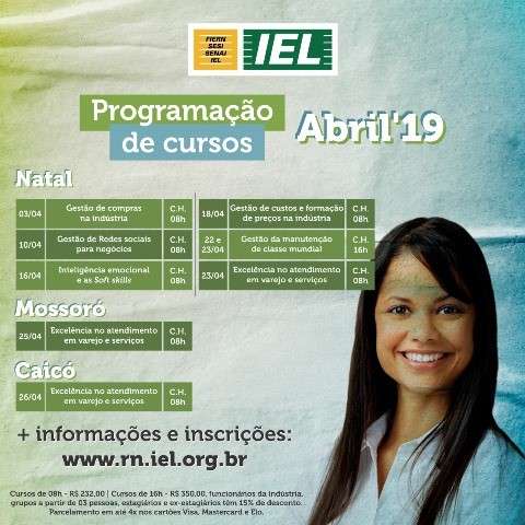 O Instituto Euvaldo Lodi (IEL-RN) está com inscrições abertas para a programação de cursos do mês de abril nas cidades de Natal, Caicó e Mossoró. São cursos nas áreas de gestão de compras, gestão de redes sociais para negócios, inteligência emocional, custos e formação de preços na indústria, entre outros. Para mais informações e inscrições …