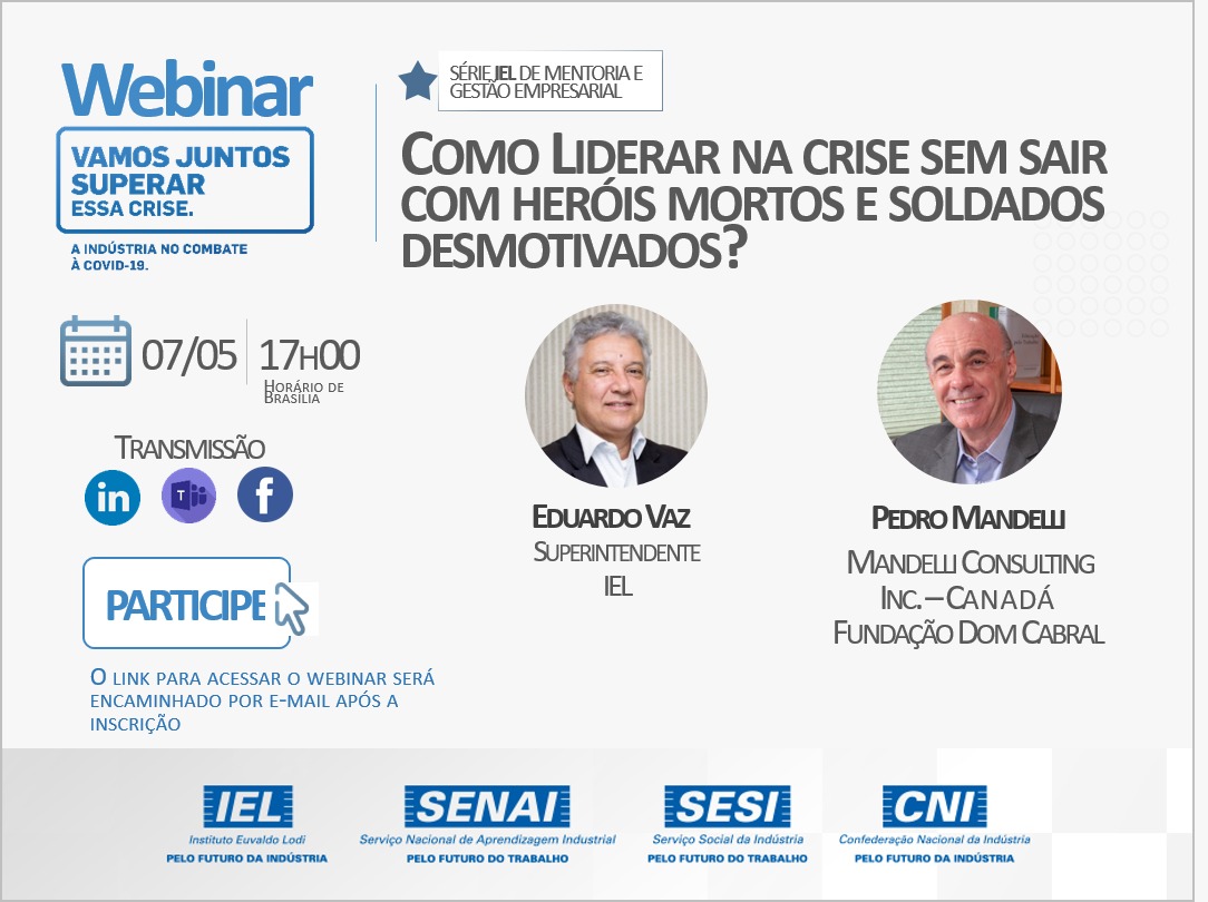 O Instituto Euvaldo Lodo (IEL) vai realizar, no próximo dia 7, às 17 horas, Webinar com o primeiro bate-papo da ‘Série IEL de Mentoria em Gestão Empresarial’, com o superintendente nacional Eduardo Vaz e Pedro Mandelli, da Mandelli Consulting Canadá e Fundação Dom Cabral. O foco é o momento atual que requer um …