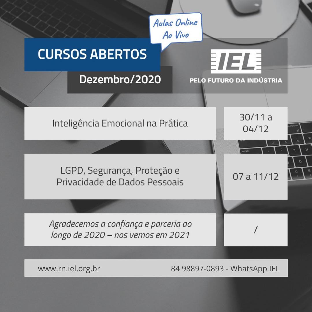 O Instituto Euvaldo Lodi (IEL-RN) está com cursos abertos para o mês de dezembro 2020 com aulas começando hoje. Confira: Inteligência Emocional na Prática – de 30.11 a 04.12.2020 LGPD, Segurança, Proteção e Privacidade de Dados Pessoais – de 07 a 11.12.2020 Mais informações no site www.rn.iel.org.br ou pelo Whatsapp IEL …