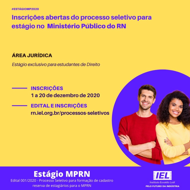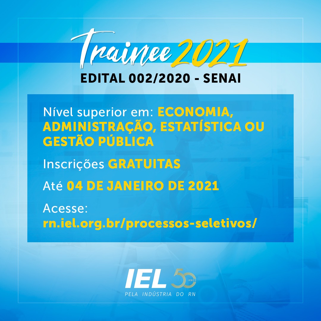 O Instituto Euvaldo Lodi no Rio Grande do Norte (IEL/RN) está com inscrições abertas para o novo processo de seleção para o programa de Trainee SENAI 02/2020. As inscrições para o programa de Trainee são gratuitas e seguem abertas até o próximo dia 04 de janeiro de 2021, pelo site do IEL/RN, no …