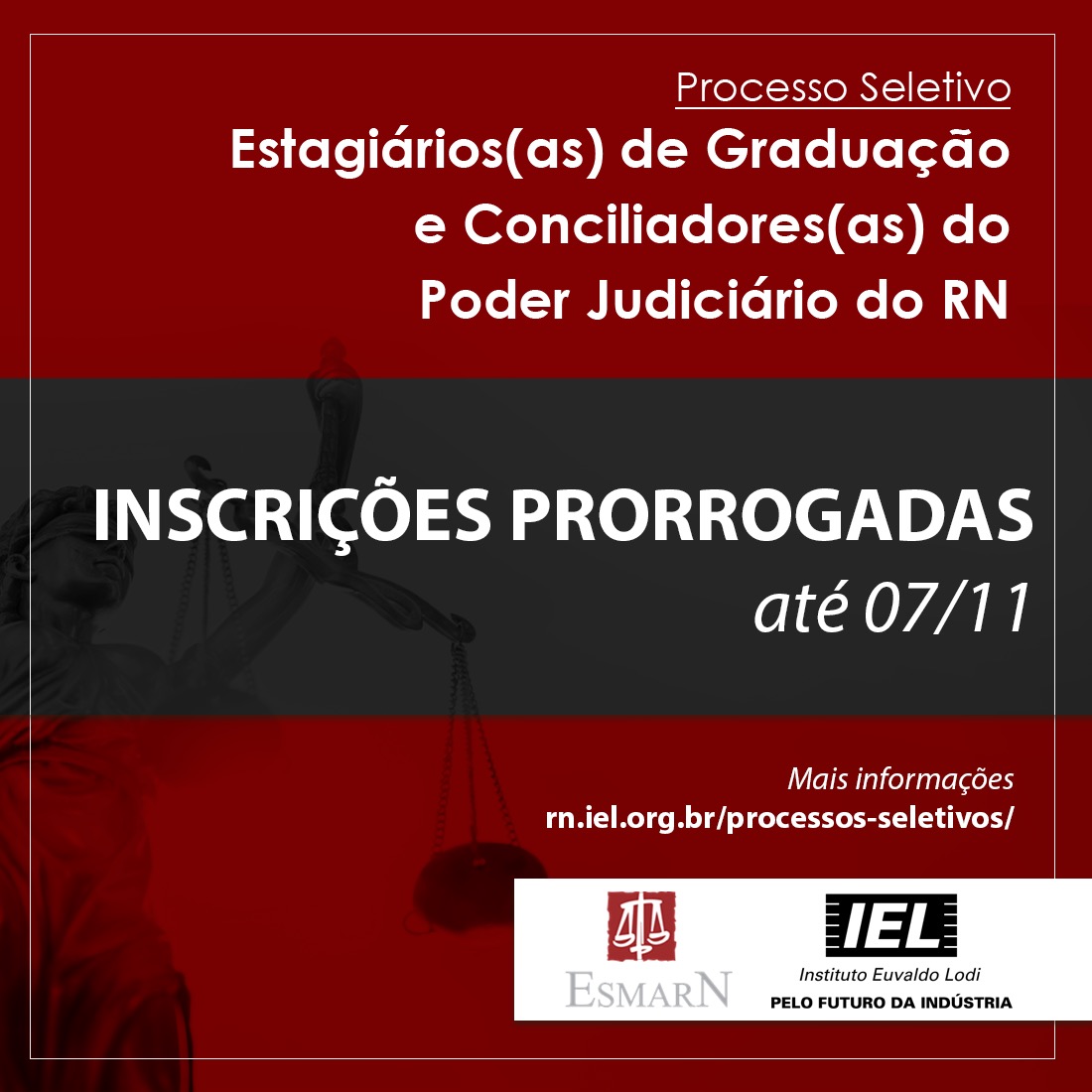 Foram prorrogadas para o dia 7 de novembro, as inscrições para o processo seletivo de 200 vagas para estagiários de graduação e conciliação do Poder Judiciário do Rio Grande do Norte. Os interessados podem consultar o edital da seleção e se inscreverem através do site do IEL-RN. As inscrições podem ser feita, pelo link: …