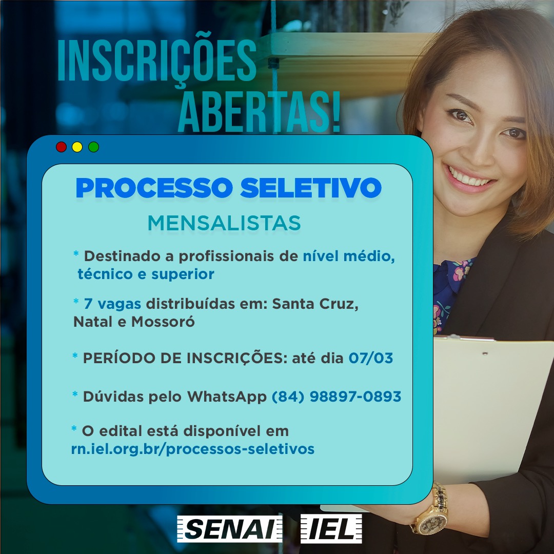 O Instituto Euvaldo Lodi (IEL-RN) inicia, nesta sexta-feira (18), as inscrições para o processo seletivo de Jovem Aprendiz do Serviço Social da Indústria (SESI-RN). As vagas são para a área administrativa, sendo 1 para Mossoró e 2 para Natal. As inscrições poderão ser feitas através do e-mail: aprendizsistemafiern@fiern.org.br De acordo com a …