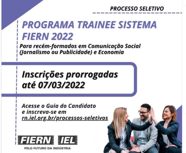 O Instituto Euvaldo Lodi no Rio Grande do Norte (IEL/RN) prorrogou para o dia 7 de março, próxima segunda-feira, as inscrições para o processo seletivo do Programa Trainee FIERN 2022. A seleção é destinada a profissionais de nível superior dos cursos de Economia e Comunicação Social (Jornalismo e Publicidade), que contemplem os pré-requisitos constantes …