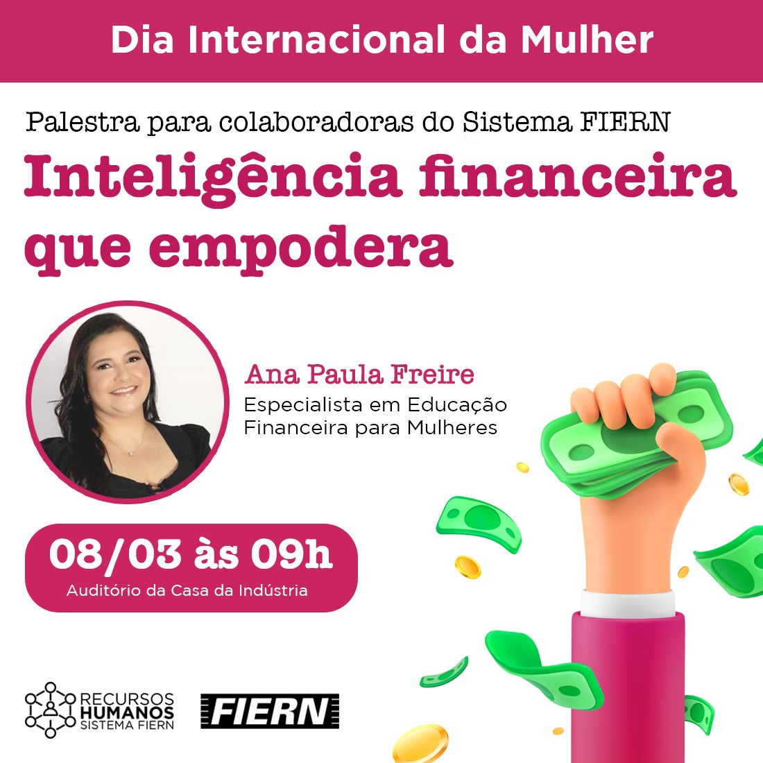 Para celebrar o Dia Internacional da Mulher, neste 8 de março, o Sistema FIERN promoverá a palestra “Inteligência financeira que empodera”, apresentada pela especialista em Educação Financeira para Mulheres Ana Paula Freire. O evento voltado às colaboradoras das entidades que integram o Sistema FIERN – FIERN, SESI, SENAI e IEL – acontece às 9h, …