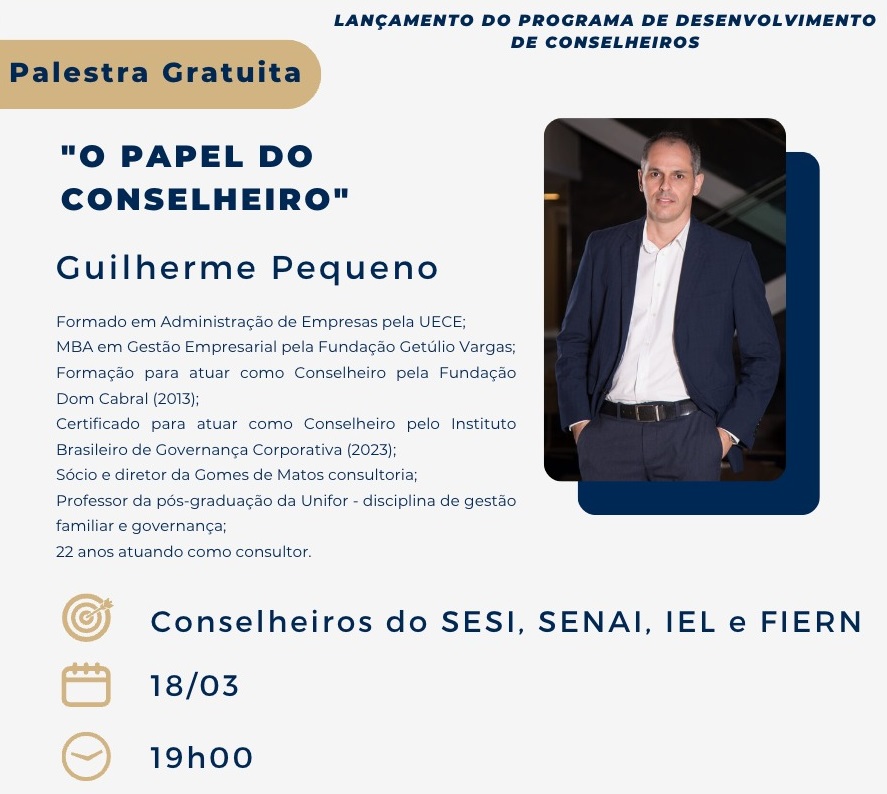 Diretores e gestores do Sistema Indústria do Rio Grande do Norte — formado por FIERN, SENAI, SESI e IEL — participaram da palestra “O Papel do Conselheiro”, proferida pelo consultor Guilherme Pequeno, na noite dessa segunda-feira (18), na Casa da Indústria. O evento marcou o início do Programa de Desenvolvimento de Conselheiros do Sistema …