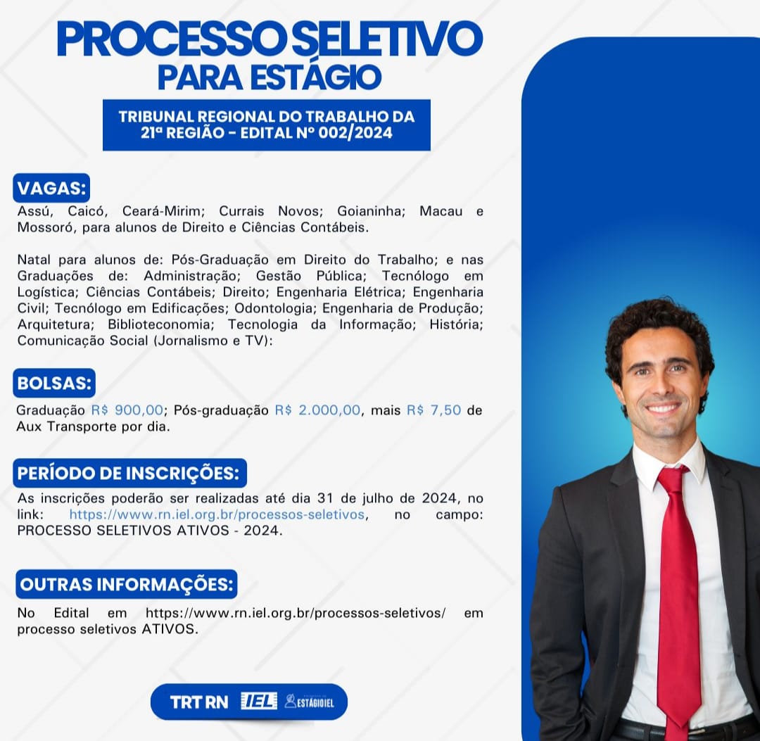 O Instituto Euvaldo Lodi do Rio Grande do Norte (IEL-RN) está com inscrições abertas para vagas de estágio no Tribunal Regional do Trabalho da 21ª Região (TRT-21). As vagas para alunos de graduação estão distribuídas em Natal, Assu, Caicó, Ceará-Mirim, Currais Novos, Goianinha, Macau e Mossoró. Em Natal, também há vagas para estagiário …
