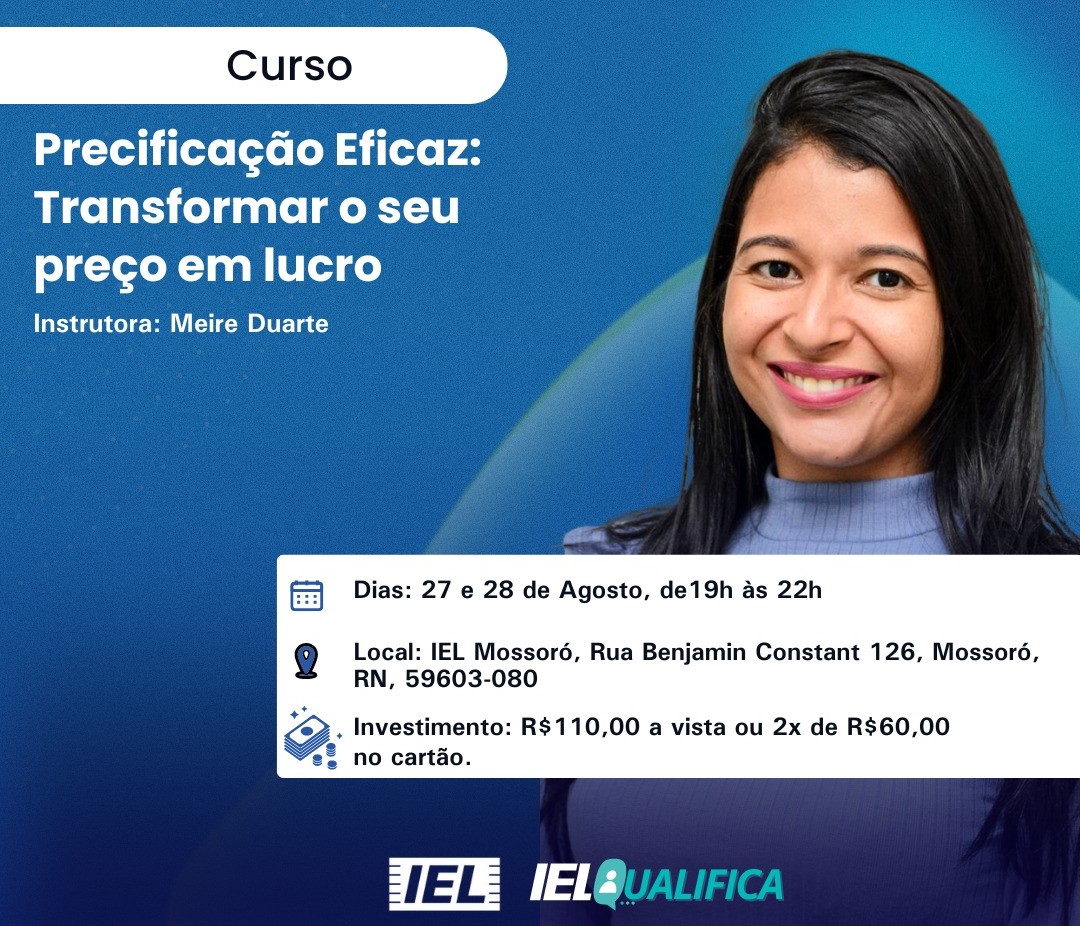 O Instituto Euvaldo Lodi (IEL-RN) de Mossoró está com inscrições abertas para um curso de “Precificação Eficaz” com Meire Duarte, que será realizado nos dias 27 e 28 de agosto, das 19h às 22h, na unidade local. As vagas são limitadas a 25 participantes, e as inscrições podem ser feitas até segunda-feira, 26 de agosto, …
